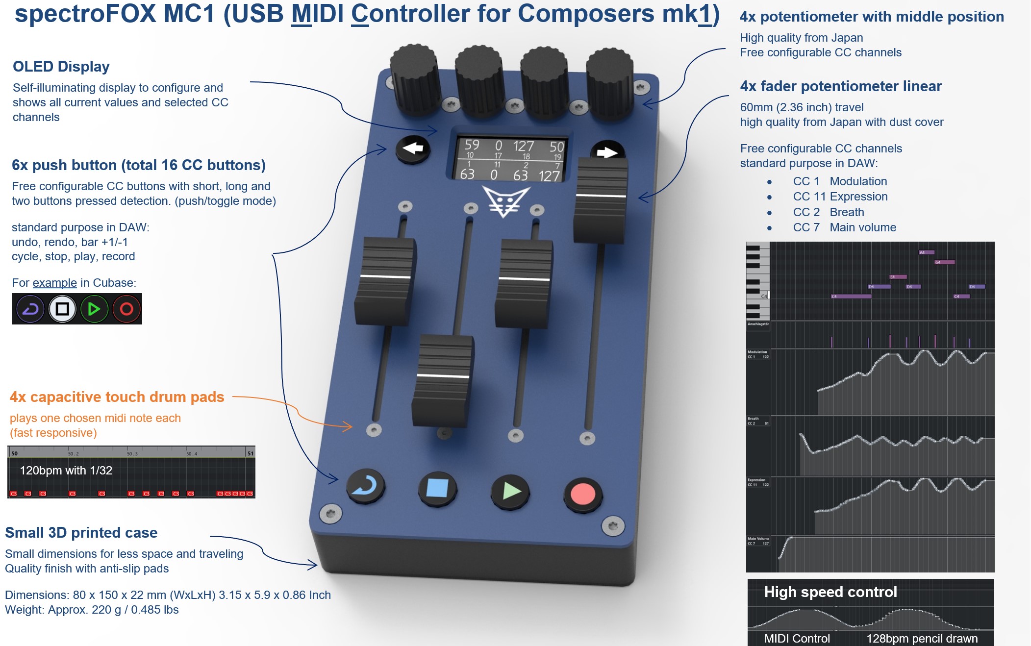 The spectroFOX MC1 (USB MIDI Controller for Composers mk1) is small enough to use on or next to the keyboard, or while traveling or composing in a mobile workspace or on-site project. It is designed so that no other device is needed, but includes all necessary functions for a smooth and fast workflow for composing.